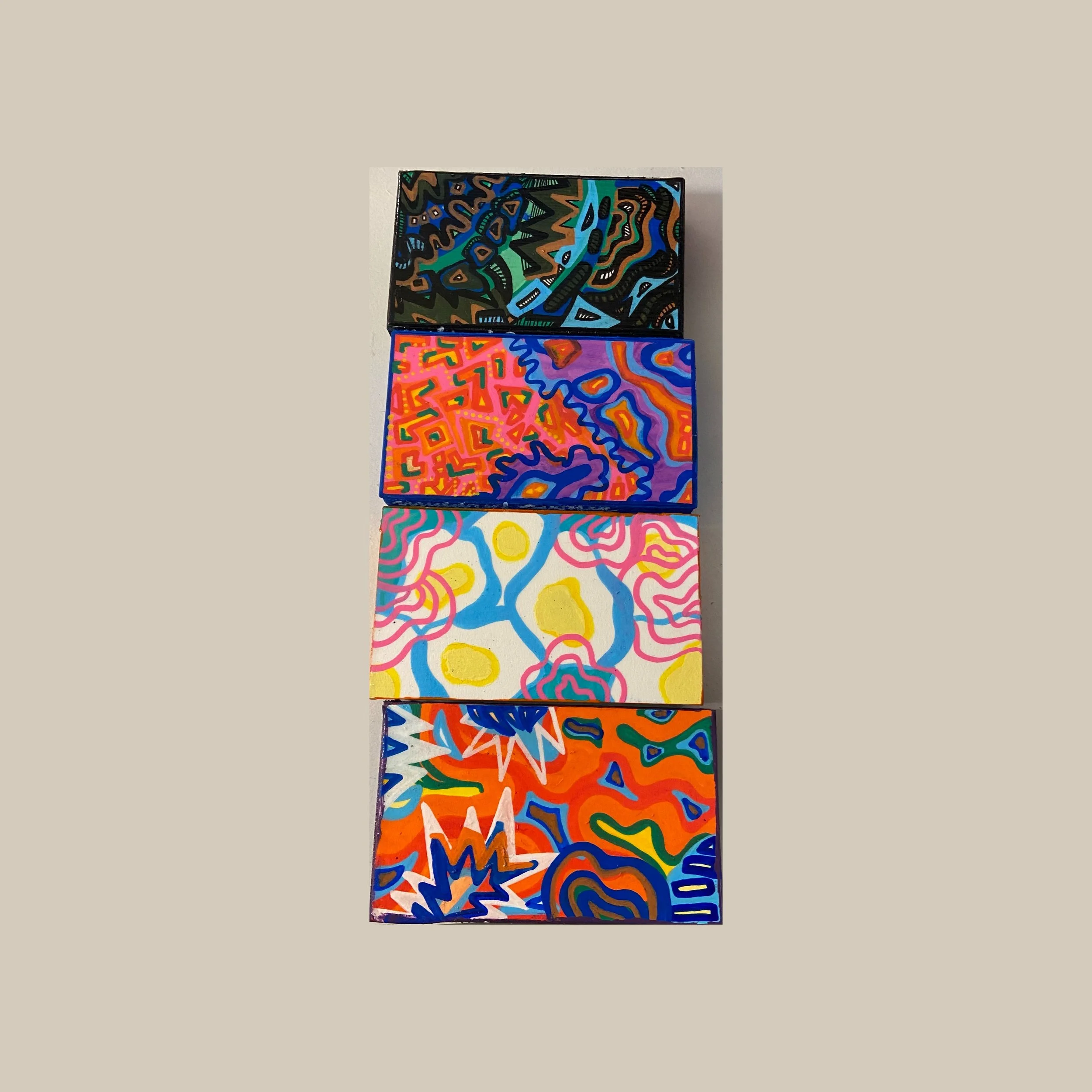 Each of my pieces are made with acrylic paint on 3.5" x 2" white cardstock, attached to a 3.5" x 2" 1-inch plywood block.